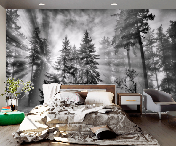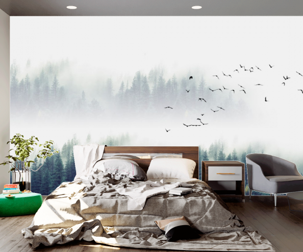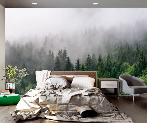 Вряд ли кого-то оставит равнодушным пейзаж хвойных лесов с высоты птичьего полета, таинственно покрытый туманом. Такие обои отлично подойдут для спальни – в них преобладают спокойные и умиротворяющие зеленые тона. Умиротворяющее действие окажут также фотообои с изображением листьев.