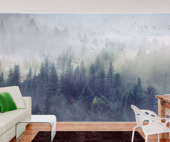 Не может не очаровать модель фотообоев, на которых изображена стая птиц, летящая над покрытыми густым туманом горами, из которого видны лишь верхушки сосен. Загадочную атмосферу в доме обеспечат фотообои “Синие горы”: на их переднем плане сверкают складки озера, а на дальнем среди тумана скрываются горы. Такие обои можно разместить как в гостинной, так и в кухне: в них преобладают светлые, спокойные тона.