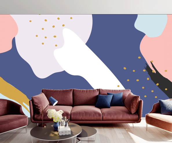 Главный признак обоев с абстрактным изображением – отсутствие четких пропорций и логических завершений. Такие фотообои могут выполнять не только фоновую роль, но и акцентную – то есть, быть главным элементом интерьера. Яркие фотообои серии “Мемфис” прекрасно справятся с этой задачей, задав тон всей комнате. Они будут привлекать к себе внимание в первую очередь. Хорошим решением будет наклеить фотообои с желтой и розовой расцветкой в гостинной или рабочем кабинете. Они оживят гостиную, и будут мотивировать и наполнять энергией в рабочем кабинете. Фотообои с темно-синей основой будут неплохо смотреться в спальне, создавая успокаивающий и умиротворяющий эффект.