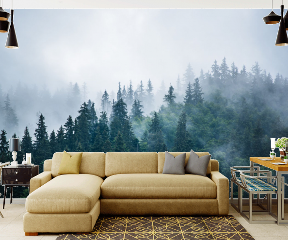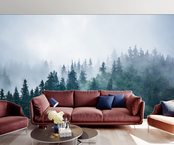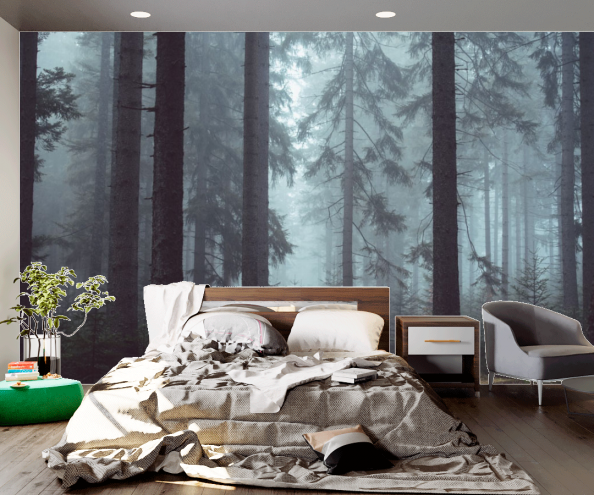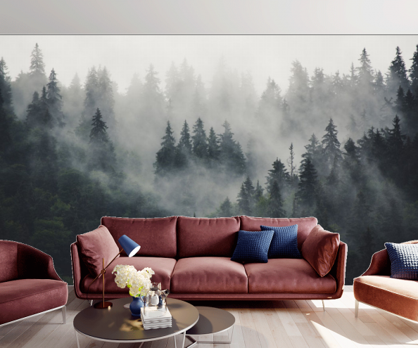 Вряд ли кого-то оставит равнодушным пейзаж хвойных лесов с высоты птичьего полета, таинственно покрытый туманом. Такие обои отлично подойдут для спальни – в них преобладают спокойные и умиротворяющие зеленые тона. Умиротворяющее действие окажут также фотообои с изображением листьев.