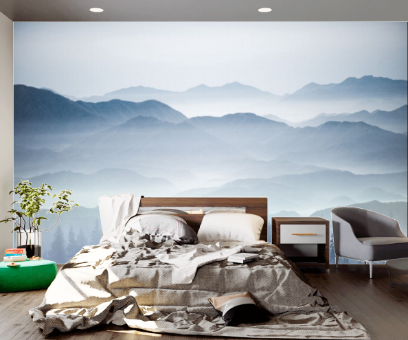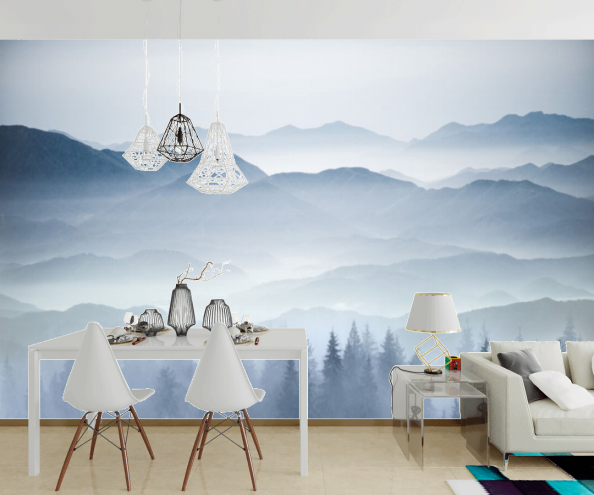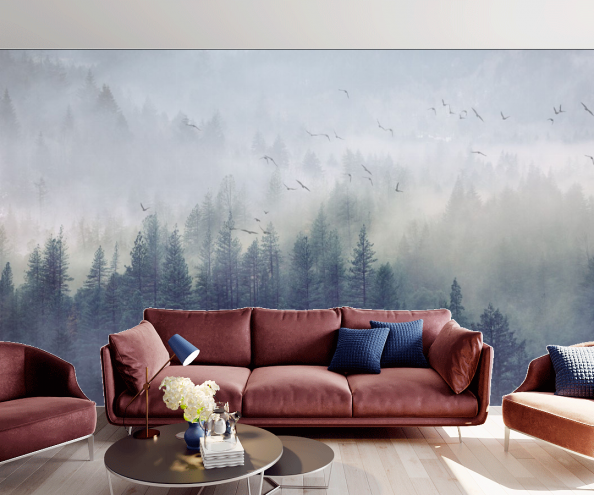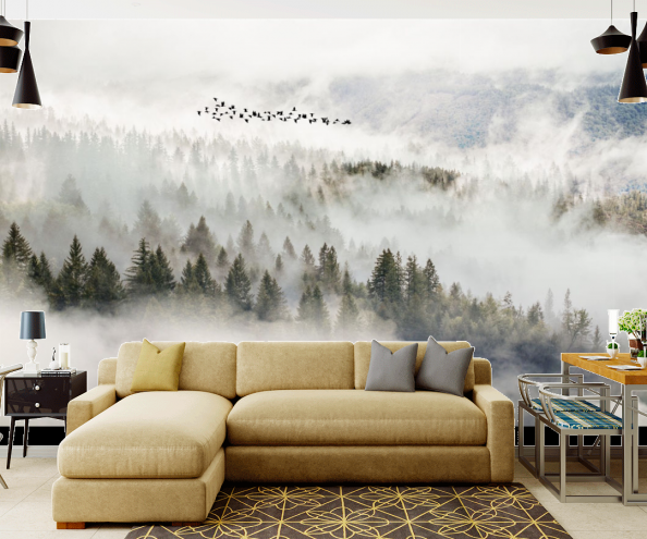 Не может не очаровать модель фотообоев, на которых изображена стая птиц, летящая над покрытыми густым туманом горами, из которого видны лишь верхушки сосен. Загадочную атмосферу в доме обеспечат фотообои “Синие горы”: на их переднем плане сверкают складки озера, а на дальнем среди тумана скрываются горы. Такие обои можно разместить как в гостинной, так и в кухне: в них преобладают светлые, спокойные тона.