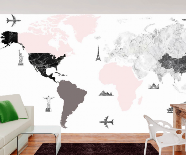 Такие фотообои — не просто удачный декор стены, это стимул. На них вы сможете отметить схему запланированных путешествий — где хотите побывать в первую очередь, а также места, которые уже посчастливилось посетить. Дизайнеры рекомендуют оклеивать подобным типом только одну стену иначе интерьер получится слишком перегруженным. На остальные же плоскости лучше подобрать однотонную облицовку. Также учтите, что рисунок должен просматриваться полностью, а не закрываться мебелью и разными предметами декора.