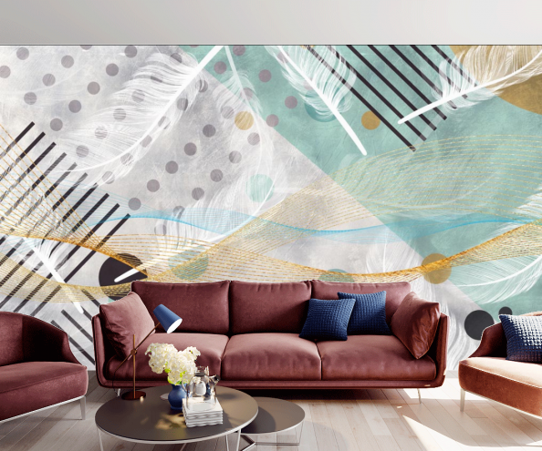 Интересным решением для гостинной или спальни станет вариант обоев “Мемфис”, на котором изображены падающие белые перья на ткань. Очарования в гостинную добавит букет пышных цветов, ворвавшихся на фон геометрических абстракций: еще один вариант из “Мемфиса”. Белый фон, дерзко охваченный желтыми, розовыми и синими мазками подойдет для энергичных людей. Фотообои с более мягкими и спокойными тонами: голубыми, зелеными и серыми, а также цветами и листьями, будто-бы аккуратно вырастающими из под плинтуса подойдет для более мечтательных натур.