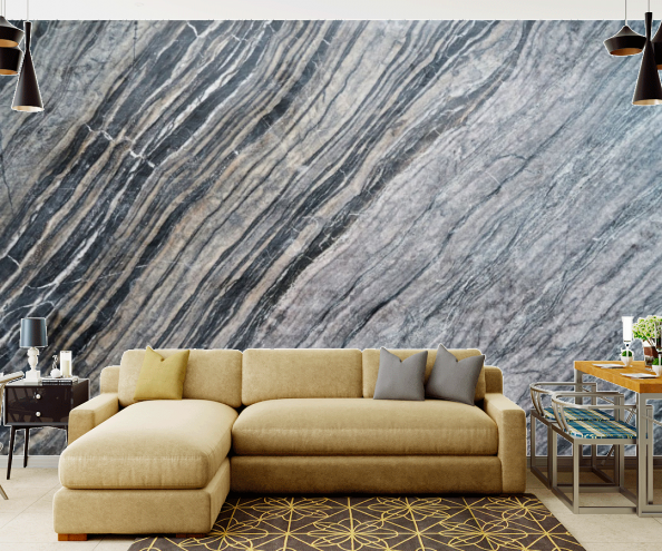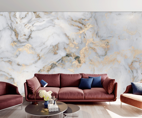 Обои в стиле серого мрамора будет отлично выглядеть в кухне или зале: спокойный серый цвет успокаивает и умиротворяет. Свежести в дизайн интерьера добавят фотообои с причудливым узором синего мрамора. В магазине есть вариант с цветной текстурой: объединение светло-голубых тонов и золотистых линий будет непосредственным решением для оригинальных людей.