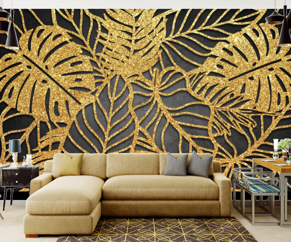 Золотистые обои подчеркивают планировку, благодаря своей яркости скрыть неровности на стенах, наполнить помещение дополнительным светом, отражая солнечные блики.