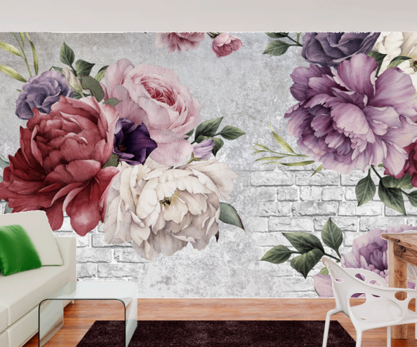• Фотообои Разноцветные пионы и кирпичная стена